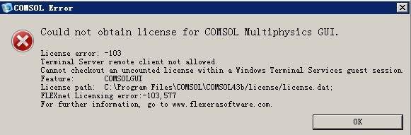 使用comsol43b的单机版(NSL)不能通过windows远程桌面连接,原因是license没有授权,官方说需要浮动网络版授权。 出现的 error信息如下: Could not obtain license for COMSOL Multiphysics GUI. License error: -103 Terminal Server remote client not allowed. Cannot checkout an uncounted license within a Windows Terminal Services guest session. Feature: COMSOLGUI License path: C:\Program Files\COMSOL\COMSOL43\license\license.dat; FLEXnet licensing error: -103,577 For futher information, go to www.flexerasoftware.com 附件中有我提供的一个解决办法,可以免除这样问题的困扰 |