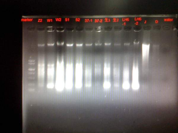 各位大虾高手,请问(1)W1,W2,37-2的点样孔周边发亮是什么原因导致的?有什么杂志吗?如何解决,俺用的是CTAB法提取的新鲜嫩叶,加入裂解液65摄氏度水浴1小时,用氯仿异戊醇(24:1)重复2遍,再用NaAc和无水乙醇沉淀的,75%乙醇清洗两遍,用灭菌水溶解,-20摄氏度保存。(2)W2,LH6-2的基因组条带是怎么回事,降解了?如果用来跑Pcr,有问题麽?(3)J的DNA是严重降解了?