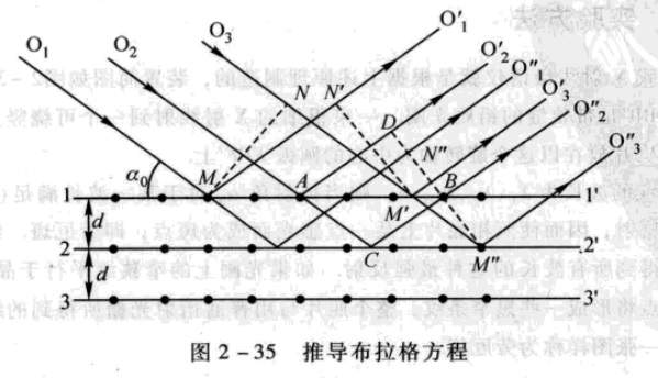 该图是布拉格衍射的光程差计算的演示图。衍射图样的观察还需要测量仪器,即拍摄衍射图样的成像系统,如照相系统或者人的眼睛。相互平行的光在成像系统中可以相遇而干涉(例如在系统的焦平面)。