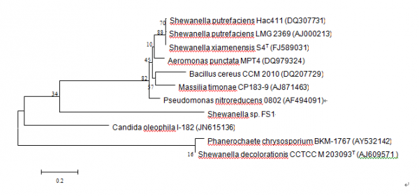 利用MEGA5.2对一株细菌16SrDNA构建系统进化树,结果发现与BLASTN结果差的好远
