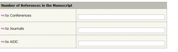 投稿时,出现如图1. 前两个好办, 分别是会议和期刊参考文献数量,最后一个是什么意思呢? 这个期刊缩写是AJC啊,怎么来了个ASJC? PS. 这个期刊全称<Asian Journal of Control>. 1.PNG |