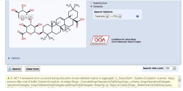 我用的不熟,现在搜索一个化合物 地肤子皂苷,想找他的相似物质。 http://www.chemspider.com/StructureSearch.aspx 每次输入后,点Exact Match 没有问题。但点Similarity搜索,搜不出内容,而是会出一段字(见下面文字以及附图)。请问是怎么回事啊? 谢谢大家。 A .NET Framework error occurred during execution of user-defined routine or aggregate "z_SearchSim": System.Exception: scanner: skip() passes after end of buffer System.Exception: at indigo.Bingo._ExecuteBingoOperation(SqlString bingo_schema, bingoOperationDelegate operationDelegate, bingoGetIndexDataDelegate getBingoDataDelegate, BingoOp op_flags) at indigo.Bingo._MakeSearch(SqlString query, SqlString table, SqlString options, SqlString bingo_schema, String search_type, Boolean highlighting, Object[] ext_options) at indigo.Bingo.SearchSim(SqlString table, SqlString query, SqlString metric, SqlString bingo_schema, SqlDouble min_bound, SqlDouble max_bound) . 无标题.jpg |