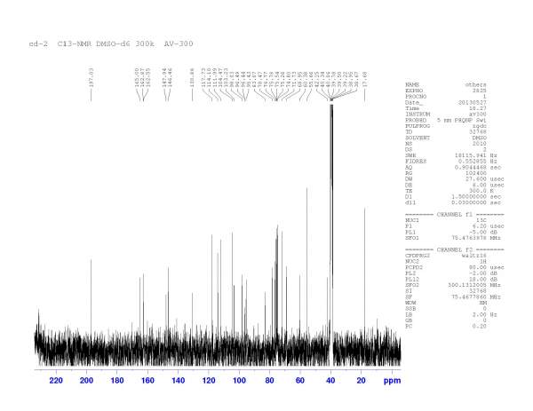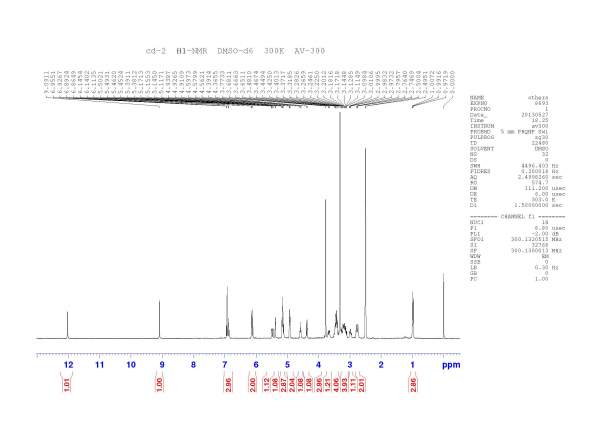 609.19 [M-H]-1,该化合物与三氯化铝反应紫外下呈黄色荧光,Molish反应呈阳性。该化合物的结构与新橙皮苷有点相似,糖基部位的化学位移有差。