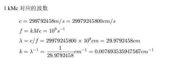 请问一下,各位大牛,以下的单位换算问题 1) kMc/sec 代表什么含义? 2) kMc/sec 与波数单位 cm-1 之间的关系是什么? |