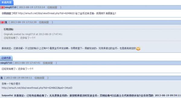 ID ning0710 在2013-08-18日于文献求助版发帖求助外文书籍章节,由于悬赏金币不足且未按版规全额发放金币,版主 baiyuefei 按版规对其进行提醒,遭其发站内消息恶语相加、辱骂。 根据版规,经版主讨论决定,对ID ning0710 处以20金币处罚,同时执行文献求助版禁言一个月的处罚。 相关证据: https://muchong.com/bbs/viewthread.php?tid=6248622 https://muchong.com/bbs/viewthread.php?tid=6248776 禁言依据: https://muchong.com/bbs/viewthread.php?tid=4491770 [ Last edited by youngen on 2013-8-20 at 11:46 ] |