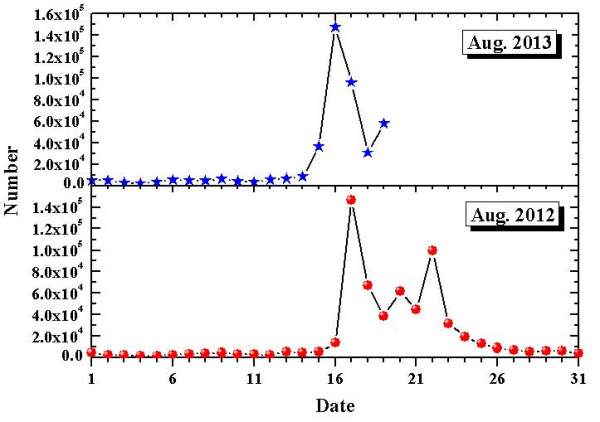 下图是2013和2012年8月份基金版发帖数,看起来很像。说明2012年基金委先在8月17日发名单给各校科技处,然后8月22日开放查询,所以发帖数在这两天分别出现一个尖峰。2013年提前一天,8月16日出现尖峰,然后应该像虫子们所说的8月21日开放查询,再出一个尖峰。 |