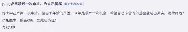 2013年5月16日在小木虫上祈福自己基金能有好运,今天终于有了好结果,特此来还愿!也祝其他虫友好运。 注:本人三流二本学校青椒,2011年博士毕业,今年最后一次申请,自己领域不认识牛人,只有自己陆续发表的9篇SCI,申请时做了一些前期研究,估计是这些起了作用,希望其他虫友多写文章作支撑,为下一次申请做好准备。 http://muchong.com/bbs/viewthread.php?tid=5900799 360截图20130820155011075.jpg [ Last edited by zkl20012001 on 2013-8-20 at 16:11 ] |