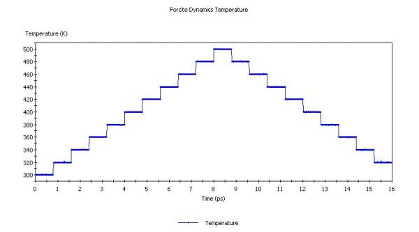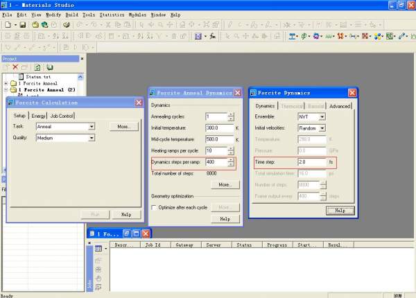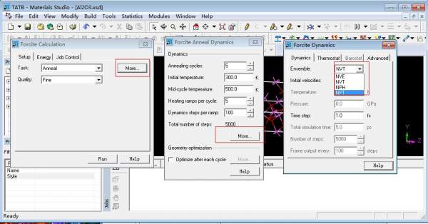 各位大侠能否指点一二。 最近做annealing退火过程时,看到文献上有这样的描述:温度范围为300-500K,温度间隔为20K,在每个间隔中进行NPT动力学100ps,在达到每个温度点(如:320K、340K)时又要进行5ns的NPT动力学。 但是我用forcite实现annealing过程时,系综只有NVE和NVT,并没有NPT;还有怎样设置在达到温度点之后进行5nsNPT呐? 附件中是从文章中接下来的annealing过程[ 来自小组 寂寞大虫家族 ] |