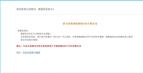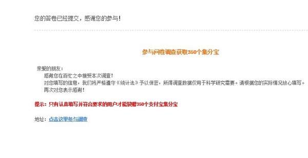 提交完毕,不会截图,复制文字如下: 您的答卷已经提交,感谢您的参与! 参与问卷调查获取350个集分宝 亲爱的朋友: 感谢您在百忙之中接受本次调查! 对您填写的信息,我们将严格遵守《统计法》予以保密,所得调查数据仅用于科学研究需要。请根据您的实际情况放心填写。 再次对您表示感谢! 提示:只有认真填写并符合要求的用户才能获赠350个支付宝集分宝 地址:点击这里参与调查 |