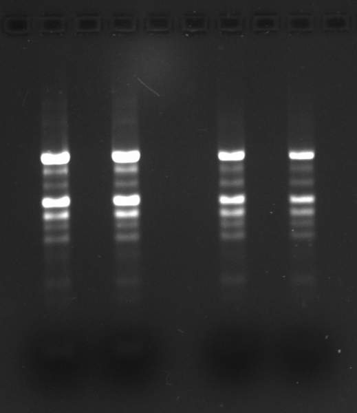 麻烦各位高手看一下我的RNA琼脂糖电泳图 这么多条带分别是什么意思啊? RNA quality check 2013-08-20.jpg [ Last edited by simpsons on 2013-8-21 at 23:40 ] |