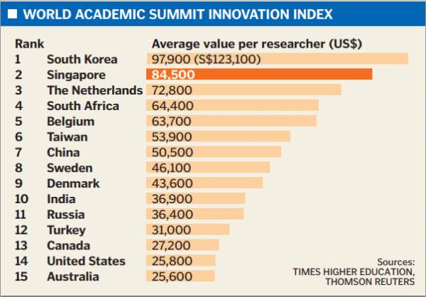 英国《泰晤士报高等教育特辑》针对41个国家和地区的400所大学进行调查,并根据这些大学在2011年至2012年的各方面数据,制定了一个"世界学术峰会创新指数"(World Academic Summit Innovation Index),并评比了这些国家和地区的研究人员所获得科研经费的多寡。该调查显示,中国研究员平均获得5.05万美元(约合31万人民币)的研究经费,在41个国家和地区中排名第七。 在此项评比中,名列榜首的是以高科技电子产品闻名的韩国。韩国科研实力备受大型企业赏识,该国研究员每人均获9.79万美元(约合60万人民币),为这些企业进行科研项目。《泰晤士报高等教育特辑》编辑贝提(Phil Baty)指出,韩国有一两个较特出的研发产品,因此登上榜首位置,不过,这不表示全韩国的大学都能获得一样多的科研经费。 值得一提的是,在十大排行榜中,亚洲国家和地区占了一半。新加坡排在榜眼位置,中国台湾地区和中国大陆分别位居第六和第七,印度排在第十位。 调查报告也显示,比起亚洲国家和地区,西方国家的表现并不突出。每年吸引大批优秀人才从事科研工作的美国,以每人平均获得2.58万美元(约15.8万人民币)研究经费占据第14位。英国排名第26,该国国际企业平均只给每名科研人员1.33万美元(约8.1万人民币)的经费。 报告指出,西方国际企业近年来把科技与电脑科学研究重点转向亚洲,原因可能是亚洲的制造业非常蓬勃。亚洲学术界长期来取得的科研成果,相信也是原因之一。 【对于中国人均科研经费超过美国和英国,我表示怀疑。假如这是真的,那么,我不知道该说什么好了】 来源 http://help.3g.163.com/13/0813/18/9669297D00963VRT.html |