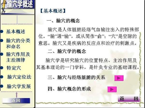 《腧穴学课件》 附件下载地址 http://www.xiaodianlv.com/ShowInfo.php?id=94044&tid=9 内容简介 本课件分上、中、下三篇。上篇为经络腧穴概论。第一章“经络概述”,阐述经络系统的主要组成内容、经络的作用及理论的临床应用。通过本章的学习,学生可了解经络的基本概念和经络系统的概貌。第二章“腧穴概述”,介绍腧穴的分类、命名、定位方法、作用和主治规律及特定穴的概念和应用等,帮助学生理解腧穴的概念,了解腧穴理论的基本内容及其临床意义。为便于学生了解经络腧穴的发展源流,第三章论述了经络腧穴理论的形成及学术的历史发展。中篇为经络腧穴各论,是本书的主体部分。其中,第四章至第十五章,为十二经络及各相应经穴的内容,先论述经络的颁和病候,再介绍腧穴的定位、主治、刺灸方法、解剖等,使学生对经络腧穴的理论和应用有具体全面的掌握。第十六章介绍奇经八脉的分布、功能和病候。其中任督脉腧穴的介绍与十二经经穴体例相同。第十七章对常用奇穴作了扼要介绍。书末附人体十四经穴和常用奇穴彩图3幅,以便学生对人体穴位有总体了解和比较。中篇的重点是经脉的循行分布、经络联系的脏腑器官及腧穴的定位和主治概要。下篇第十八章“经络的纵横关系”,阐述根结、标本、气街、四海的基本概念、内容及其意义和应用,利于学生对经络的纵横、内外关系及腧穴的作用规律的综合理解。下篇第十九章“经络腧穴现代研究”,介绍了近年经络腧穴研究中的一些研究成果和有关经络腧穴实质的一些观点和假说,目的是启发、培养学生的科研思路和方法。书末附录部分,选录了常用的经络腧穴歌赋,收录了《脉书·十一脉》的内容,供学习时参考。 |