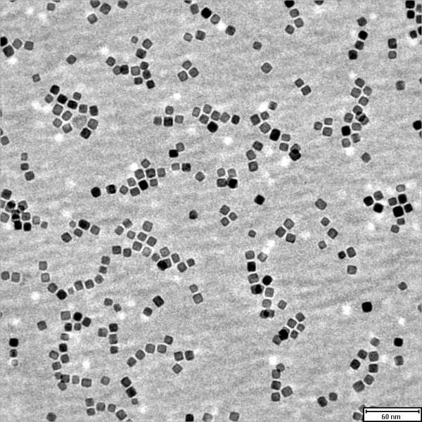 本人第一次做油酸铁热分解制备四氧化三铁磁性粒子,不知道是不是哪里操作不准确,得到了一批尺寸在5nm左右,立方体形状的磁性粒子,不过磁性不是特别好,在乙醇中可以被磁铁吸到一边,在正己烷中就成磁流体了。