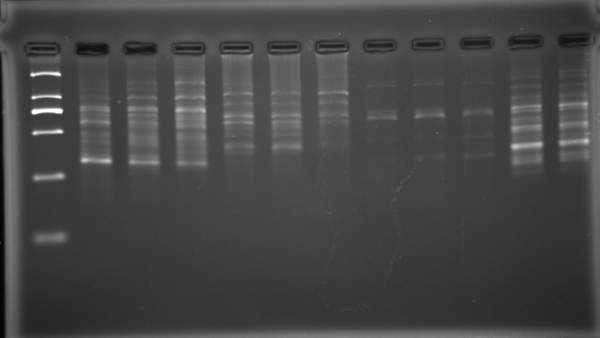 下图是我筛选引物时跑的PCR图,我刚接触这块,请各位帮我看看可以用来做指纹图谱不?从左到右分别是marker、引物1(退火温度53.5、50.1、48)、引物2(退火温度51.6、50.1、49.1)、引物3(退火温度44.3、43、42)、引物4(退火温度45、42),请各位前辈指导交流下,谢谢.PS:引物3退货温度还要继续筛选,能知道下,该往哪个方向走吗,谢谢