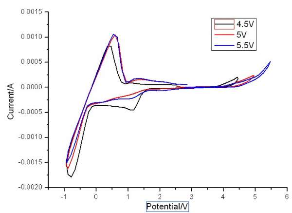 请大神们看看,这个CV图 测试的是电解质隔膜,测试体系为:锂片/隔膜/不锈钢片,扫描速度10mv/s,电压范围分别为-1~4.5V,-1~5V,-1~5.5V 为什么尾部都会上翘呢?是开始分解了吗? CV.jpg [ Last edited by 茹忆浅浅 on 2013-8-27 at 21:40 ] |