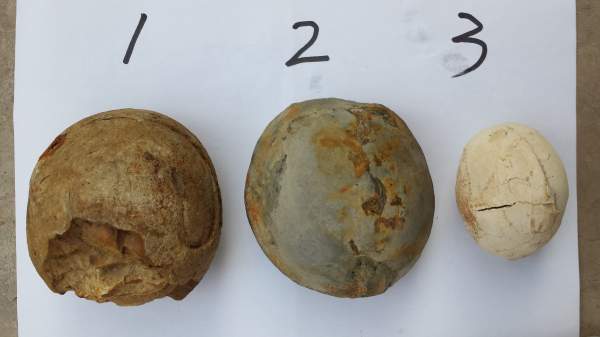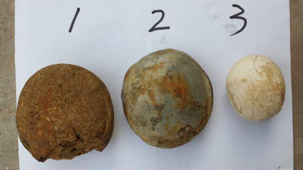 广东梅州,发现地不详,农民兄弟拿来问是否恐龙蛋,说发现了很多。专家鉴定结果:不是恐龙蛋。很好奇这3个形状奇似恐龙蛋的砾石是怎样形成的?哪位大侠能解释一下。两张照片分别是砾石的两面。