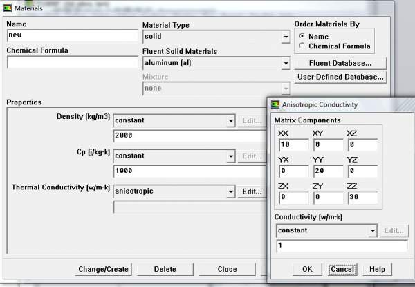 fluent里怎样设置各向异性的导热系数呢? Define — Materials里anisotropic里弹出的matrix components是什么意思,是在xx,yy,zz里面分别输入x,y,z三个方向的导热系数值吗?比如沿x,y,z方向导热系数分别为10,20,30的材料,是如下图那样设置的吗? 材料.jpg |