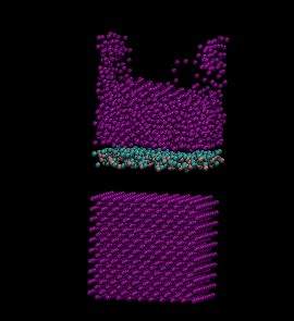 # 3-d LJ flow simulation dimension 3 boundary p p p units metal lattice bcc 2.8664 atom_style full neighbor 2.0 bin neigh_modify every 1 delay 5 check yes bond_style harmonic angle_style harmonic read_data layer(13).lammps05 #read_restart restart.equil mass 1 15.9994 mass 2 1.008 mass 3 55.847 bond_coeff 1 25.6971 0.9572 angle_coeff 1 2.385 104.5 pair_style hybrid eam/fs lj/cut 8.6 pair_coeff 1 1 lj/cut 0.006596 3.1507 8.6 pair_coeff 2 2 lj/cut 0.0 0.0 8.6 pair_coeff 3 3 lj/cut 0.2589 4.3 8.6 pair_coeff 1 2 lj/cut 0.0 1.57535 8.6 pair_coeff 2 3 lj/cut 0.0 2.15 8.6 pair_coeff 1 3 lj/cut 0.04132 3.72535 8.6 pair_coeff * * eam/fs Fe_mm.eam.fs NULL NULL Fe region lob block INF INF INF INF INF 5.7328 side in units box group lob region lob region lohwc block INF INF INF INF 5.7328 14.332 side in units box group lohwc region lohwc region londc block INF INF INF INF 14.332 33.664 side in units box group londc region londc region water block INF INF INF INF 33.664 49.9583 side in units box group water region water region upb block INF INF INF INF 72.8895 84.1223 side in units box group upb region upb region uphwc block INF INF INF INF 64.2903 72.8895 side in units box group uphwc region uphwc region upndc block INF INF INF INF 49.9583 64.2903 side in units box group upndc region upndc group hwc union lohwc uphwc group ndc union upndc londc group mobile union londc upndc water lohwc uphwc group boundary union lob upb group upper union upb uphwc upndc group upmov union upb uphwc timestep 0.0001 minimize 1.0e-4 1.0e-6 100 1000 reset_timestep 0 #initial velocity timestep 0.0001 velocity all create 333 482748 fix 1 upb rigid group 1 upb fix 2 mobile nve compute t_h mobile temp fix 3 mobile temp/rescale 1 333 333.1 0.02 1.0 fix_modify 3 temp t_h fix 5 upb aveforce NULL NULL -0.25675 fix 6 lob setforce 0.0 0.0 0.0 compute temp_mobile mobile temp thermo 100 thermo_style custom step temp etotal c_temp_mobile dump 3 all atom 100 output.pfx.lammpstrj run 700000 unfix 1 fix 8 upb move linear 0.5 0.0 0.0 compute t_b boundary temp fix 9 boundary temp/rescale 1 333 333.1 0.02 1.0 fix_modify 9 temp t_b run 800000 upto compute s upb stress/atom compute str upb reduce sum c_s[1] compute minx_upb upb reduce min x compute maxx_upb upb reduce max x compute miny_upb upb reduce min y compute maxy_upb upb reduce max y compute minz_upb upb reduce min z compute maxz_upb upb reduce max z variable lx_upb equal c_maxx_upb-c_minx_upb variable ly_upb equal c_maxy_upb-c_miny_upb variable lz_upb equal c_maxz_upb-c_minz_upb variable vol_upb equal v_lx_upb*v_ly_upb*v_lz_upb variable s_yz equal v_ly_upb*v_lz_upb variable stress equal c_str/v_vol_upb variable friction equal v_stress*v_s_yz fix 10 upb ave/time 1 800000 1000000 v_friction file upb.temp thermo 100 thermo_style custom step temp etotal c_str v_stress v_vol_upb v_s_yz v_friction dump 4 all atom 100 output1.pfx.lammpstrj run 1000000 upto write_restart restart.equil |