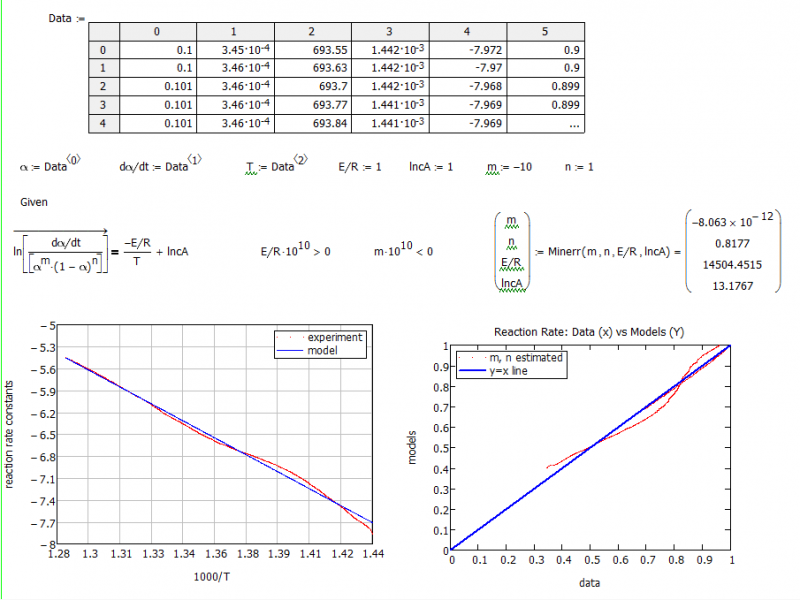 | 聚合物热降解动力学模拟问题:目标函数ln(dα/dt*1/[α^m*(1-α)^n])=ln(cA)-E/RT;了解这方面的大神应该都清楚我列的这个函数吧,有点不清晰请谅解哈!然后使用mathcad对该函数进行优化,使方程左边对1/T的线性关系达到最佳(文献上是这么说的),得到最优的m、n值,然后根据优化结果的斜率和截距求出活化能E和预前因子A。其中的dα/dt,α,T都有相对应的实验数据。 |