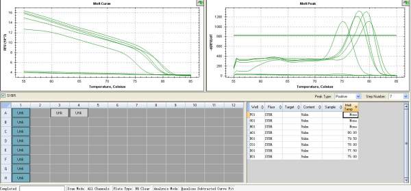 我用的是对称PCR系统,SYBgreen显示荧光,做的是个75-82℃的一个梯度解链,出来的溶解曲线也是依次递减的,但是电泳都是同一条带,我就想问一下溶解曲线应该显示产物特异性的,出现不同Tm理论上应该是有非特异性产物出现,但是电泳显示又是同一条带,所以迷踪了,希望能有大神解答,谢谢 附件为机测图谱 |