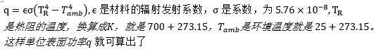 由于本人没有学传热学,找了两本书一直没找到这个问题的计算公式,特在此向大家求助!如帮忙解决问题有30金币相送。谢过先! 问题如下:对一根规则形状的钛合金材料通过电流自阻加热方式对其进行加热,将其置于空气中(假设25度),当材料温度稳定在700度时,自阻加热设备需要提供多大功率? |