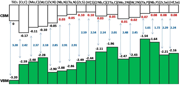我通过VASP计算得到了一系列掺杂物质的能带数据和DOS,看到文献上有做出不同掺杂元素后的band offsets图,我也想做出如以下附件的图,但是在origin里做出柱状图的大小和禁带宽度展示的总是不太好,请教各位大侠如何作图 Bandoffses |