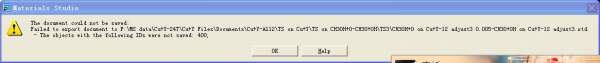 上传的图好像看不清,我把文字传上来了 The document could not be saved: Failed to export document to F:\MS data\Cu+Y-24T\Cu+Y Files\Documents\Cu+Y-Al12\TS on Cu+Y\TS on CH3OH+O-CH3O+OH\TS3\CH3OH+O on Cu+Y-12 adjust3 0.005-CH3O+OH on Cu+Y-12 adjust3.xtd. - The objects with the following IDs were not saved: 400, |