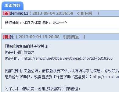 ID deming11 在2013-09-04日于文献求助版发帖求助文献,由于求助格式不正确,版主 TF-花雨流间 按版规对关贴操作,遭其发站内消息恶语相加、辱骂。 根据版规,经版主讨论决定,对ID deming11 处以10金币处罚,同时执行文献求助版禁言一个月的处罚。 相关证据: https://muchong.com/bbs/viewthread.php?tid=6319265 926ZQRSQMNEL%P757QS}}SB.jpg 禁言依据: https://muchong.com/bbs/viewthread.php?tid=4491770 [ Last edited by yaoyunfei on 2013-9-4 at 21:15 ] |