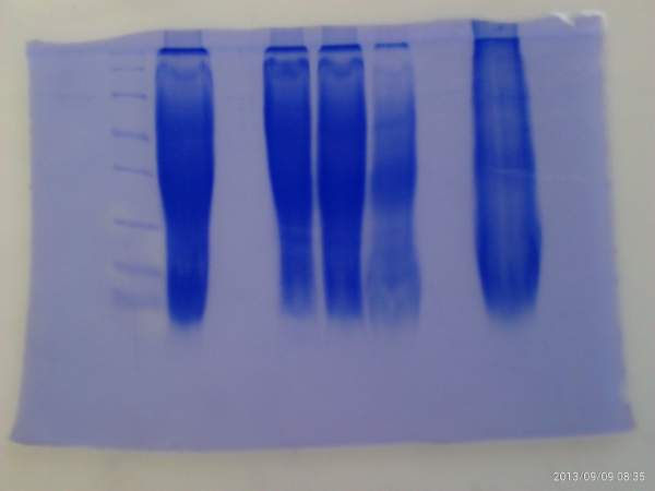 大家好,本人最近在提取粘细菌的总蛋白,却发现跑不出条带,我方老师是说杂质太多,,,,我用超声法提取,裂解液是8Murea,2M硫脲,CHAPS,DTT,这些都有加入,,,浓缩前浓缩后都是没有条带的,,,,很沮丧,,求大家帮忙