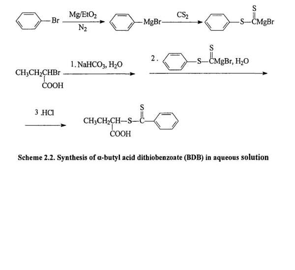 请问我在文献中截图的这一段文字描述的合成过程中是否存在问题? 为什么在制备二硫代苯甲酸溴化镁的后可以向其中加水,这样子二硫代苯甲酸溴化镁不是就水解了吗?怎么能在水环境下和α-溴丁酸钠反应生成二硫代苯甲酸α-羧基丙酯?(示意图中二硫代结构有错误,请不要理会)。 未命名.JPG 路线图.JPG |