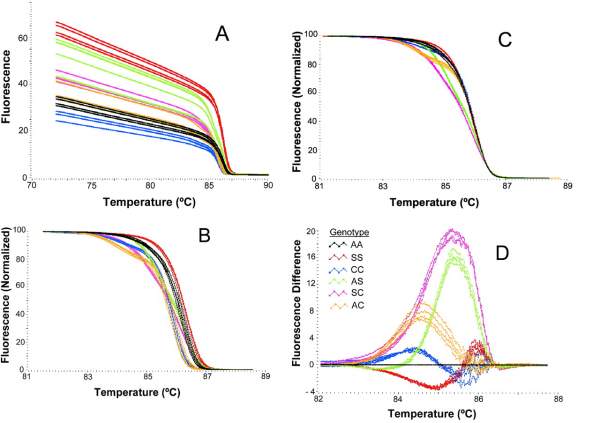 The original high-resolution melting curves (A) include two different individuals for each of the six different genotypes, each individual run in duplicate. (B), the same curves as in panel A after normalization. (C), normalized curves after temperature-shifting of each curve to overlay them on one of the AA curves between 5% and 10% fluorescence. (D), fluorescence difference curves obtained by subtracting each curve in panel C from one wild-type (AA) curve (for clarity, the other AA samples are not shown). Because of the shift in temperature of the curves in panels C and D, the temperature axis no longer reflects absolute temperatures but rather reflects temperature differences relative to the superimposed segments of the curves.