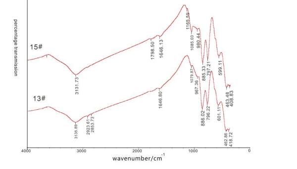 900--1200Ö®¼äÁ½Õ߯×ͼ²»Í¬£¬15#¶àÁË1165.59Õâ¸ö·å£¬¶øÇÒ1085´¦µÄ·å½Ï13#·æÈñ