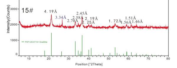 Ö÷ҪΪÁ½¸öÑù£¨13#£¬15#£©£¬¾ùΪÌìÈ»ÑùÆ·¡£Ö®Ç°´¦Àí¹ýµÄXRDͼ³õ²½¼ø¶¨ÎªÕëÌú¿ó£¬XRD´¦ÀíͼÈçÏ£¬ÆäÖÐ15#ÖÐ0.334nmµÄ·åÖµÅж¨ÎªÊ¯Ó¢µÄÑÜÉä·å¡£µç×Ó̽ÕëÊý¾ÝÏÔʾ£¬Ö÷Òª×é³ÉΪFeO£¬º¬Á¿75%ÒÔÉÏ£¬ÆäËûËùº¬ÔªËØÓÐ Si Zn Al P Cu As Pb Ni Co Mn ¡£º¬Á¿´óС¼û¸½¼þ£¨µç×Ó̽ÕëÊý¾Ý£©