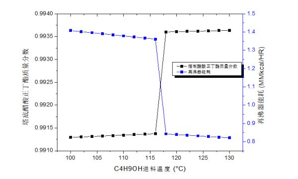 您好!再麻烦您一下,我还想问一个问题,我在模拟反应精馏物料加料温度的影响时如图,为什么那个温度之间纯度和能耗相差这么多,而且是突变,这正常吗?http://