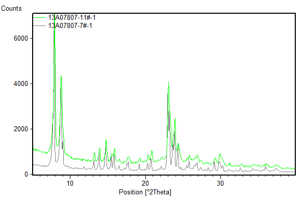 大侠们求助,刚用XRD做了两个样品,绿色谱线代表的样品催化测试有效而黑色谱线代表物质测试催化没有效果,两个样品应该是同种物质,纵坐标强度不同说明样品区别在哪啊?