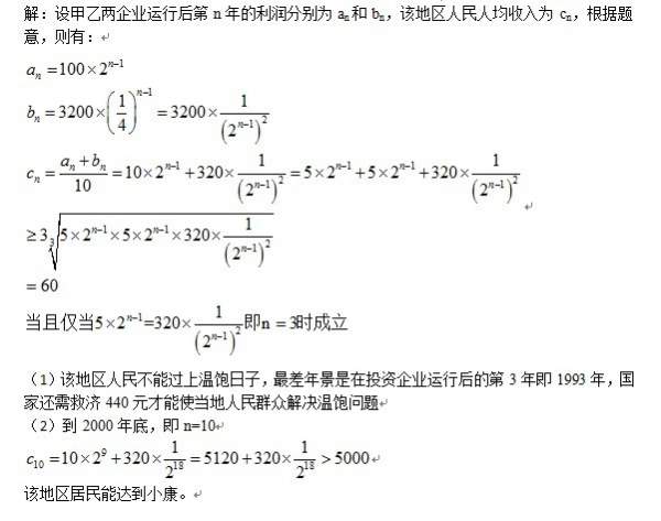 某10万人口的贫困地区,1991年初国家实行开发型扶贫,投资兴办两个企业,其中甲企业第一年实现利润100万元,以后每一年以翻一番的速度长盛不衰,乙企业第一年实现利润3200万元,以后每年利润减为上一年的1/4,若以人均年收入500元为温饱线,人均5000元为小康线计算,问:(1)该地区能每年过上温饱日子吗?若能,请说明。若不能,求最差年景,国家还需救济多少才能使当地人民群众解决温饱. (2)到2000年底,该地区人民生活能达到小康吗? |