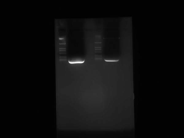 各位大侠,我做了两个载体的双酶切电泳片子,双酶切条带大小分别是360(图片中第二泳道)和560(图片中第四泳道),做了好几次还是这样的结果,下面老是有一大坨东西,不知道是什么原因,求各位大侠指导。Marker是DL2000的,从上到下大小分别是:2000、1000、750、500、250、100 2013-8-23.JPG |