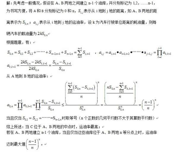我来说一下: 实际问题是复杂的,这里我们假定 1. 汽车耗油量与路程成正比 2.汽车运输次数很多,使得初次运输可以忽略。 设AB长为1(单位) 汽车每次载油量为 1 (单位) (1)只有一个油库的情况 设油库离A x (单位) 根据假定2 汽车到一次油库往返一次 耗油 x 输油率(1-x), 由油库到B输一次油 往返一次 耗油(1-x) 此次输油率x。总共输油率为(1-x)x (2)推广到n个油库的情况 设油库1到A的距离X1,油库2到油库1的距离X2,~油库n到油库n-1的距离Xn 则X1+X2+~+Xn=1 总输油率为 (1-X1)(1-X2)~(1-Xn) 有不等式 a1a2~an=<[(a1+a2+~+an)/n]^n a1=a2=~=an时两边相等 则(1-X1)(1-X2)~(1-Xn)=<[(1-x1+1-x2+~+1-xn)/n]^n=[(n-1)/n]^n 即总输油率最大为 [(n-1)/n]^n |