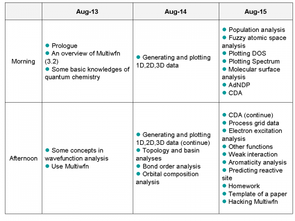 Multiwfn 2013年暑期培训班感想与杂谈 文/Sobereva 2013-Sep-17 在2013年8月13日至15日,在北京科技大学召开了第一届波函数分析暨Multiwfn培训班,此文就随便、没有条理地谈谈此次培训班的感想以及展望。会议的一些介绍可以见此会议的第二轮通知,http://hi.baidu.com/sobereva/item/a3f9453cc8f438c11a9696ce。 此次培训班全部所用的幻灯片,包括现场演示的一些动画可以在此处下载http://pan.baidu.com/share/link? ... p;amp;uk=1074012119。 培训的时候正赶上帝都最热的时候,完全就是桑拿,随便出门走走就浑身湿透,学员从全国各地跑来也真是辛苦。虽然个人喜欢在冬天办活动,不过寒假又短又有春节,也不得已只能在暑假进行。 培训时的一些照片如下(笔者是自带马赛克和视觉扭曲效果的存在,勿见怪) ![]() ![]() ![]() ![]() 这次培训班实际上已经酝酿已久。在2011年的时候,就打算找个机会开个Multiwfn培训班。起初打算先弄个非正式的第0届培训,也就三四十人的规模,但一直时机不成熟。这次很不容易终于开了培训班,而且从全国各地来了多达120余人,最后比较圆满顺利地结束。对于第一次弄培训班来说,这挺难得。这个波函数分析&Multiwfn培训班不仅仅这一次,肯定会一直办下去,每隔一年或一年半一次。 本次培训完全免费,食宿完全由学员自己负责。不统一安排食物一方面是因为没钱给大家提供,二是也没这个必要(虽然有违国内培训/会议的传统),因为开各种学术会议,与会者往往会吐槽统一供应的食物不佳,经常主动在外面吃。 除了13号到15号白天的讲课外,在每天晚上,以及16号全天也都提供了答疑、讨论时间。参与讨论的人众多,一点空闲都没有,其中一天晚上甚至还畅谈到了夜里11点。和年轻的计算化学工作者讨论感觉相当不错,气氛相当自由愉快。 最初打算办这个培训班的时候本来打算为期两天,本以为内容不多,两天就够了,甚至还富裕。但是到了培训第二天才发现失算了,讲的进度明显落后于预期,稍微在机子上演示一下时间就迅速过去了。结果只好演示得比较快,去掉不少例子,学员自行练习的时间和当场答疑的时间也都迫不得已去掉了,即便如此最后还有不少主题没法讲而只能被迫一带而过,这着实有些遗憾。之所以在时间安排上会失算,其实也正体现了波函数分析内涵之丰富,Multiwfn功能之强大,以至于三天根本介绍不完。 实际讲课的时间按排如下所示。其实这个安排和本人最初的预计有天壤之别,到第二天和第三天,是一边讲一边修改后续的时间安排。 第一天上午先把Multiwfn程序的基本功能非常简略地介绍了一遍,目的是给学员一个对Multiwfn的初步、总体的认识。随后讲了量子化学的基本知识,目的是为了在学习后面的内容的时候不会感到有基础知识上的障碍。第一天下午介绍了波函数分析的许多重要概念,但是有一部分概念是在随后两天结合着Multiwfn的具体的模块一起讲的。第一天最后讲了讲Multiwfn的使用上的基本知识,比如怎么安装、怎么生成波函数文件之类。 第二天和第三天以现场演示,结合少量理论讲解为主。第二天上午一直在讲怎么绘制实空间函数,虽然看起来没有太多好讲的,起初也只留了大概两节课的时间,但讲起来才发现,要演示的例子、要讲解的选项太多,结果讲了一上午还没完全讲完,这也是因为Multiwfn的用处太大、灵活度太高所致。下午接着将之讲完后,就讲拓扑分析和盆分析模块、键级分析、轨道成分分析。 第三天安排得相当紧,讲了布居分析、模糊空间分析、绘制态密度、绘制光谱、分子表面分析、AdNDP(一带而过)、CDA、格点数据处理、电子激发分析、杂项功能、弱相互作用分析、芳香性分析(一带而过)、反应位点预测。然后还给大家留了个作业题,让大家结合本次培训所学的知识研究乙炔三聚化过程中电子结构的变化。本来想好好讲讲怎么修改Multiwfn的代码,幻灯片做了很多,结果最后只能花10分钟时间随便一带而过了。 第三天下午很简略、随意地介绍了一下如何撰写名为A theoretical investigation on XX或XX: A DFT / ab initio study (XX代表某个新颖体系)的文章。当时用的幻灯片做了较大修改,在这里可以下载最新的:http://pan.baidu.com/share/link? ... p;amp;uk=1074012119。这是个颇有特色的讲授内容,以前肯定从没人这么介绍过。说实话,凡是以这种标题为名的文章,90%以上都是灌水文章。我讲这个绝非想让学员灌水,特别在幻灯片最后一页还用大字写明:“灌水可耻”。之所以讲这个,是希望学员能开阔思路,随便找个分子,脑子里就能想出通过波函数分析手段拿Multiwfn程序能去分析它的哪些方面获得有价值的信息。其实,拿Gaussian一通算,然后用Multiwfn做一通分析,一篇文章的数据量就够了,写写这样的文章作为练习,比如让研究生练练手是很有益的,但是若这样翻来覆去在期刊上灌水,比如换个元素灌一篇、换个基团灌一篇,这样绝对是学术界的祸害。我希望用户通过Multiwfn程序能得到有益的结论、有创新性的观点,而不是将之作为灌水的利器。 开这个培训班最主要的目的就是在中国普及波函数分析方法,让广大计算化学工作者了解到Multiwfn的基本使用,并投入到实际研究中。如果说量子化学计算计算出的波函数相当于合成出的化合物,那么波函数分析就可以形象地比喻成化合物的表征。合成出一个物质,不表征就什么有益的信息也不知道;同样地,计算出个波函数,不进行波函数