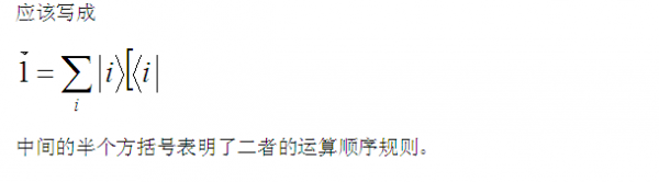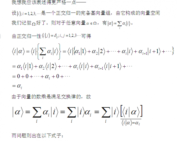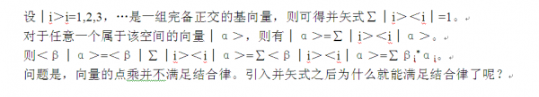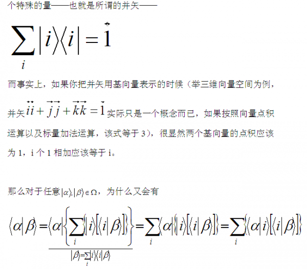 其实还可以理解的再简单一些,你所谓的并矢不简单是一个概念而已,如果把向量α及β写成矩阵的形式问题就简单多了。关键是Σ|i><i|=I这个根本就不是数乘。 我们举个例子,根据正交归一条件,<i|i>+<j|j>+<k|k>=3,但是请注意 |i><i|+|j><j|+|k><k|=I已经不是数,是一个单位矩阵。 这个例子中总共三个维度相互正交,我们就可以写成|i>=(1 0 0),|j>=(0 1 0),|k>=(0 0 1)。当然这只是举个例子,基矢的取法并不唯一,结论很显然。 如果根据矩阵的规则,这个就可以很简单证明。 这些公式在量子理论的表象变换中应用甚广,说白了就是投影算符,我们都当做算符来处理。 |