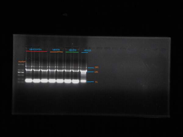 我提取昆虫幼虫的全RNA,照相图从左往右依次是6龄、5龄、3龄幼虫的RNA。跑完后最前面的5S条带特别亮,28S的条带特别暗,不知道这是怎么回事,maker用的是2000。求知道的同学帮忙分析一下吧。 PQ_Image.jpg |