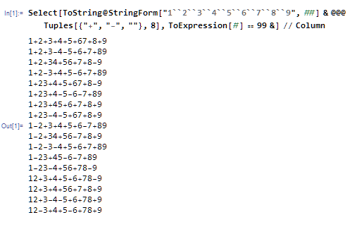 编程实现 在1、2、3、4、5、6、7、8、9这一串数字中间,加入运算符号"+"或"-",使其代数和等于某个数。 例:当输入99,要输出1-23-4+56+78-9=99 1-23+45-6-7+89=99 1+2+34+56+7+8-9=99 1-2+34+56-7+8+9=99 1+23+4-5-6-7+89=99 1+23+4+5+67+8-9=99 1+23-4-5+67+8+9=99 1+23+45+6+7+8+9=99 12+3+4+5+6+78-9=99 12+3-4-5+6+78+9=99 12-3+4+5-6+78+9=99 12+3+4+56+7+8+9=99 1+2+3-4-5+6+7+89=99 1+2-3+4+5-6+7+89=99 1-2+3+4+5+6-7+89=99 1-2-3-4+5+6+7+89=99 1+2+3+4+5+67+8+9=99 |