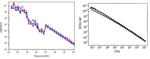 我做的涂层的Bode谱图和文献上的怎么差别这么大呢 左边是我自己做的,右边是文献上的,高人给解释下
