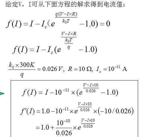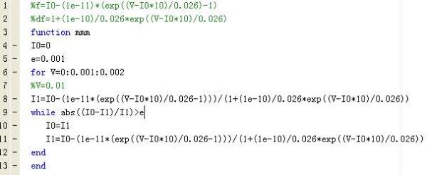 %f=I0-(1e-11)*(exp((V-I0*10)/0.026)-1) %df=1+(1e-10)/0.026*exp((V-I0*10)/0.026) function mmm I0=0 e=0.001 for V=0:0.001:0.002 %V=0.01 I1=I0-(1e-11*(exp((V-I0*10)/0.026-1)))/(1+(1e-10)/0.026*exp((V-I0*10)/0.026)) while abs((I0-I1)/I1)>e I0=I1 I1=I0-(1e-11*(exp((V-I0*10)/0.026-1)))/(1+(1e-10)/0.026*exp((V-I0*10)/0.026)) end end |