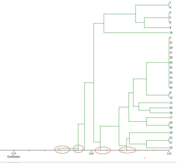 请大侠帮忙,万分感谢! 谁能告诉我这个NTSYS用于REP,ERIC等分子分型的时候,最后那个相似指数是怎么确定的?有的文献里是76%有的是66%还有的。。。。都不一样,这个是自己定的吗?怎么定? 我做出来的图肿么跟文献里的不一样呀?这些节点是什么意思呀? eric-1.gif |