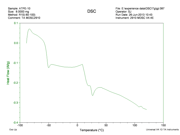 各位大神,我合成的高分子聚醚胺(常温下液体),DSC测试过程中,二次扫描后,Tg以后在室温附近出现类似台阶,又像是吸热峰的,不知如何解释?大家帮我想想呢