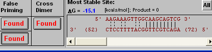 你看到这个false priming的product=0了吗,也就是说该错配不会产生PCR产物,但是其影响引物的有效浓度。但是如果TM够高,应该问题不大, cross dimer你就要小心了,大于10就别用了。当然,不能完全看数值,要看3‘端,如果3’的结合不多,又没有更好的选择,也能用。 另外,引物可以edit的,只要模板不是特别短,应该能挑个可以用的。 祝好运! |