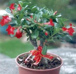 沙漠玫瑰 学 名: Adenium obesum 别 名: 天宝花 科 属: 夹竹桃科沙漠玫瑰属 类 别: 多肉植物 生长习性 沙漠玫瑰又名天宝花,原产非洲的肯尼亚。喜高温干燥和阳光充足环境。耐酷暑,不耐寒,耐干旱,忌水温。以富钙质、排水好的沙壤土为宜。冬季温度不低于10℃。 繁殖 常用扦插、嫁接和压条繁殖,也可播种。扦插,以夏季最好,选取1-2年生枝条,以顶端枝最好,剪成10厘米长,待切口晾干后插于沙床,插后约3-4周生根。嫁接,用夹竹桃作砧木,在夏季采用劈接法,成活后植株生长健壮,容易开花。压条,常在夏季采用高空压条法,在健壮枝条上切去2/3,先用苔藓填充后再用塑料薄膜包扎,约25天生根,45天后剪下盆栽。夏季播种,发芽温度21℃。 栽培 盆栽需阳光充足和排水好。以肥沃、疏松的沙和腐叶土的混合土最好。生长期宜干不宜湿,夏季高温每天浇1次水,平时每2-3天浇1次。全年施肥2-3次。冬季干旱休眠期正常落叶。 |