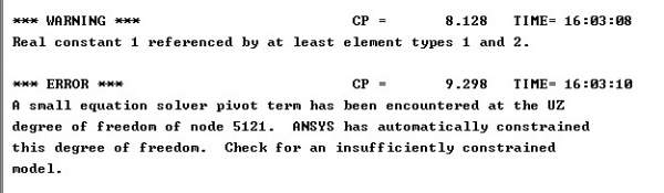 第一个警告应该是:在划分 beam188 单元时,实常数也被设置为 1,造成与 mass21 或 link8 单元有相同的实常数编号。由于 beam188 单元不使用实常数,在划分 beam188 单元时,可以将实常数编号设置为 blank,即命令: real, ! (后面不跟任何参数) 第二个错误是说 z 向缺少约束,但是未必就是节点 5121 处需要增加约束,只是因为 ANSYS 在分解方程的过程中,做到节点 5121 时发现的问题,所以报错为 5121 节点 z 向缺少约束。你应该分析一下整个模型,看看需要在那里增加约束。 |