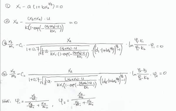 遇到了一组比较棘手的方程组,打算用编程求解。 有人提议用牛顿数值法,不知道是不是合适。 可是,有几个式子的偏导可难倒我了。 希望打人能帮帮忙,看一下。 式子在附件里面,x1,x2,x3,x4是未知数,其余都是已知的。 谢谢! 未命名.jpg [ Last edited by aapril on 2013-10-7 at 04:48 ] |